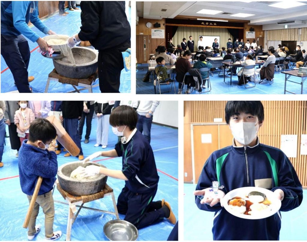 12月6日(土)には、米作りの1年の集大成である、餅つきイベントを行いました。お餅の味付けは、生徒のお手製みたらしときなこ、いそべ餅です。 炊き立てのもち米を参加者の皆さんと農業科学科2年生でつきました。つきたてのあたたかいお餅を囲みながら、参加者の皆さんと田植えから餅つきまでの1年を振り返る、楽しい時間を過ごすことができました!