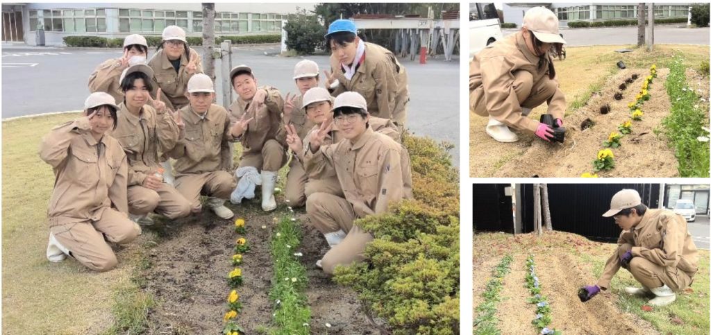 11月18日に半田市内にある瀧上工業株式会社様の花壇に環境緑化専攻2年生が栽培した草花を植栽しました。2回目ということもあり、生徒はスムーズに植栽することができました。
